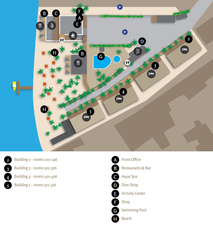 Amenities: Features an on-site dive shop, outdoor pool, wellness facilities, and direct beach access