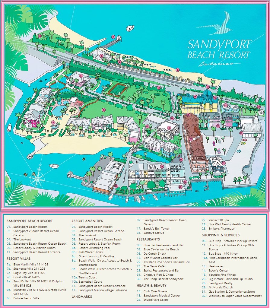 Resort Style and Construction: Features a charming, colorful, and quaint Bahamian village-style architecture. The resort is known for its laid-back atmosphere and picturesque setting with pastel-colored buildings, white sandy beaches, and crystal-clear waters.